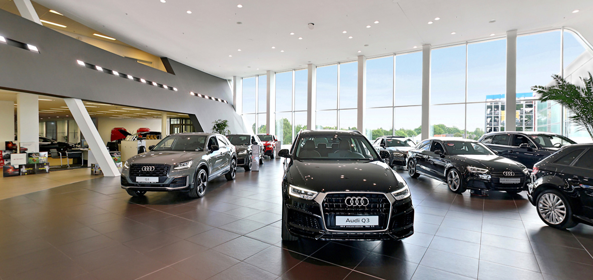 …zumindest solange das Portfolio der Marke mit den 4-Ringen so schön stillsteht wie für die jüngste 360°-Aufnahme. So letzte Woche in einem Hamburger Audi-Haus der neueren Generation. Die Decken sind hoch, der Raum öffnet sich weit. Eine sehr interessante Architektur mit spannenden Diagonalen und großen Fensterflächen mit viel Tageslicht, welches „gebändigt“ werden will. Das fertige Panorama ist unter der Rubrik 360° zu sehen.
